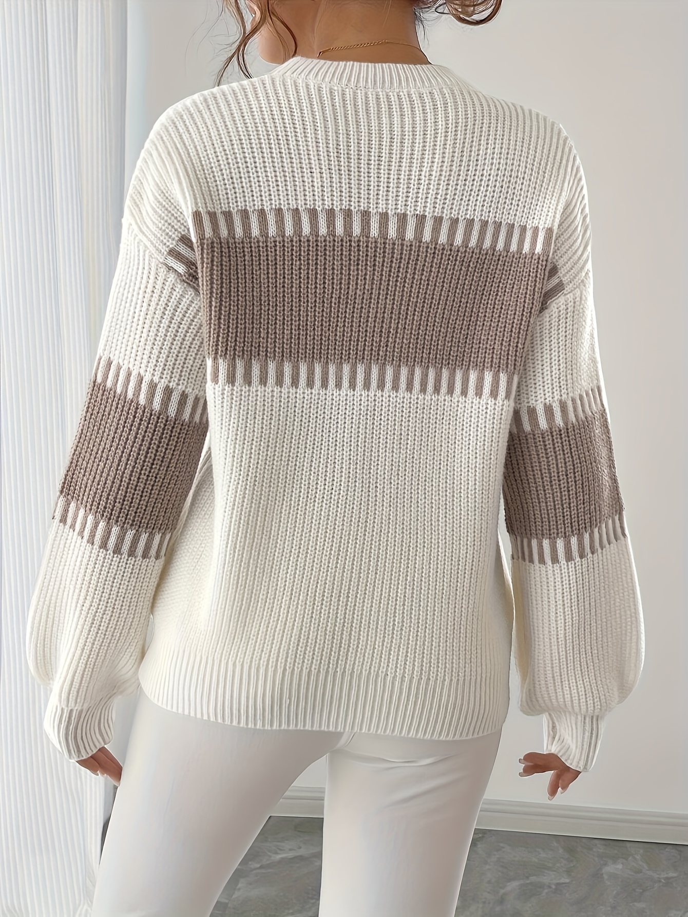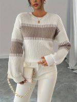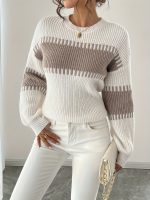 Home Women's Sweaters Women’S Elegant White & Brown Striped Sweater – Soft Stretchy Pullover with Round Neck, Long Sleeves, and Color Block Design for Fallu002FWinter, Casual & Formal Wear, Casual Wear Sweater | Round Neck Sweater | Stretchy Fabric